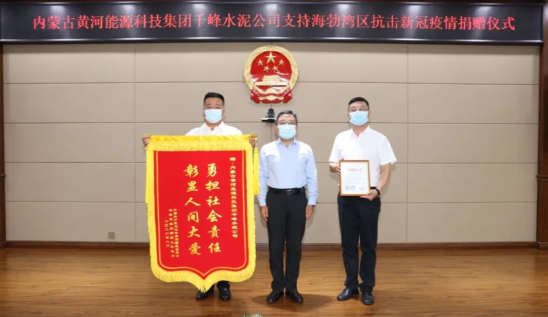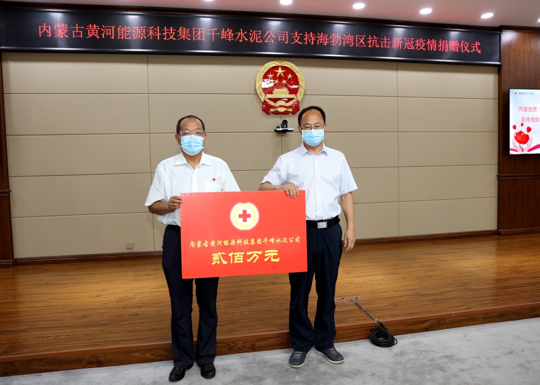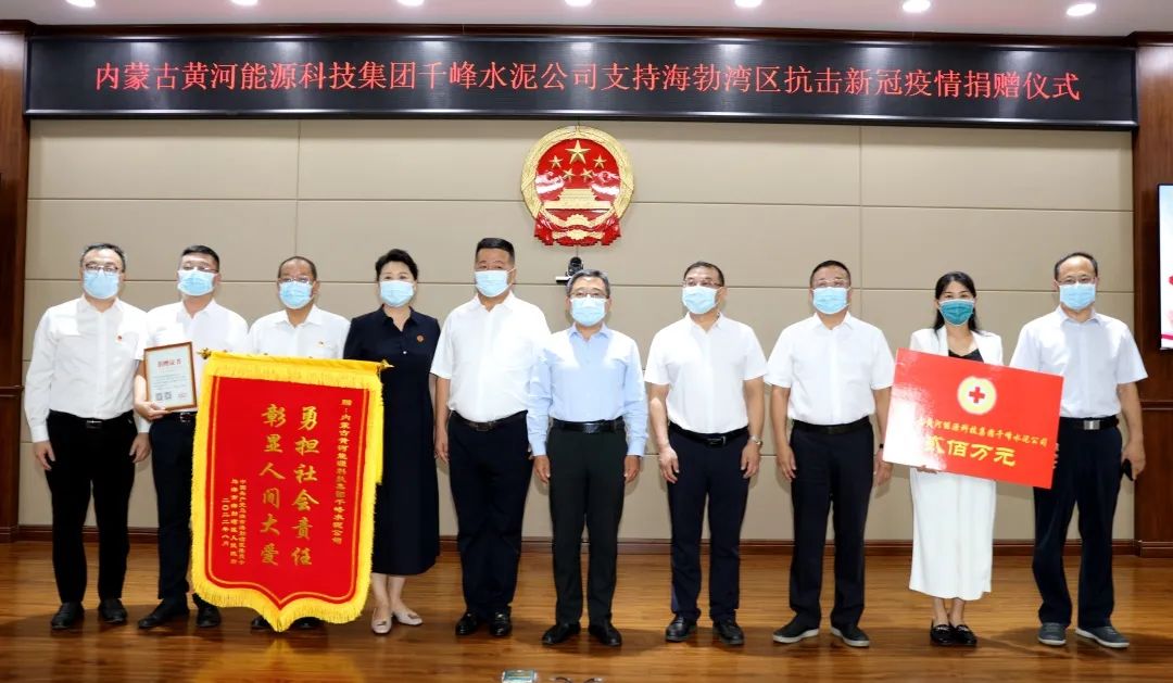 8月10日,內蒙古黃河能源科技集團千峰水泥公司抗疫捐贈活動儀式在海勃灣區人民政府舉行,烏海市委常委、海勃灣區委書記孫昊,區委副書記、政府區長崔洪波,黃河集團董事長馬文義等領導出席捐贈儀式。黃河集團千峰水泥公司捐贈200萬元支持海勃灣區抗擊疫情。