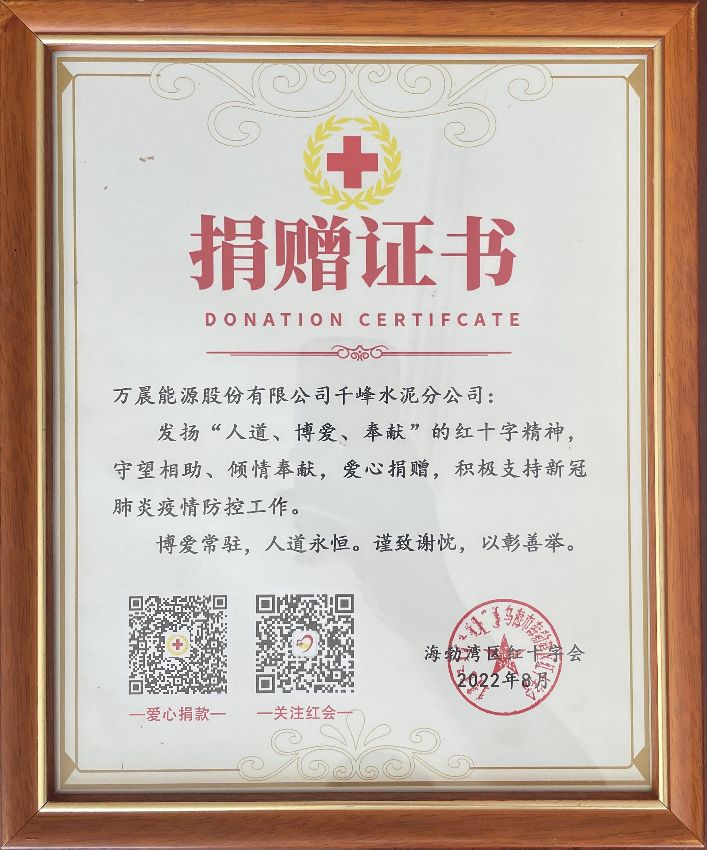 萬晨能源股份有限公司千峰水泥分公司獲海勃灣區紅十字會捐贈證書