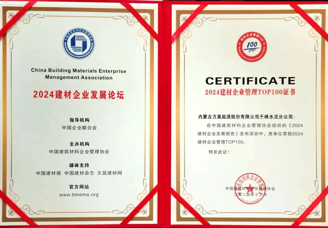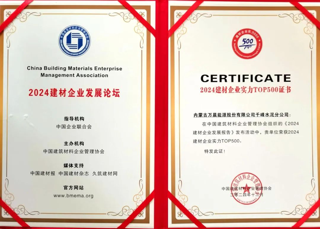 內蒙古黃河集團旗下的千峰水泥,在由中國建筑材料企業管理協會舉辦的《2024年建材企業發展報告》發布盛典中,榮耀登榜“2024年建材企業實力500強”與“建材企業管理100強企業”。